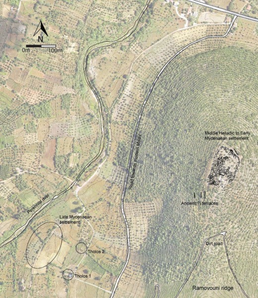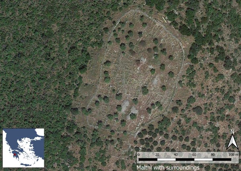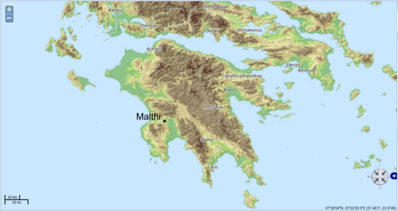 Durante l’età del bronzo, una fiorente comunità esisteva su e intorno a Malthi, lo sperone settentrionale della catena montuosa di Ramovouni, situato a pochi chilometri dal villaggio di Vasiliko nella Messenia settentrionale. Sulla cresta stessa, a circa 100 metri sopra il fondovalle, era situato un insediamento fortificato dell’età del bronzo medio-tardo. Da qui si godeva di una splendida vista sulla valle, che offriva facili comunicazioni tra l’entroterra del Peloponneso e la costa. Sotto lo sperone montuoso sono state individuate diverse tombe a tholos ed un secondo insediamento dell’età del bronzo tardo, finora quasi completamente inesplorato. Inoltre, in tutta la valle e nelle sue colline circostanti, sono stati identificati circa 16 siti dell’età del bronzo medio, il che suggerisce che il paesaggio fosse densamente abitato. Grazie a lavori estesi sia in passato che negli anni più recenti, Malthi offre un’insolita opportunità di studiare un insediamento dell’età del bronzo completamente scavato e ben conservato, con pochi paralleli contemporanei sulla terraferma greca.