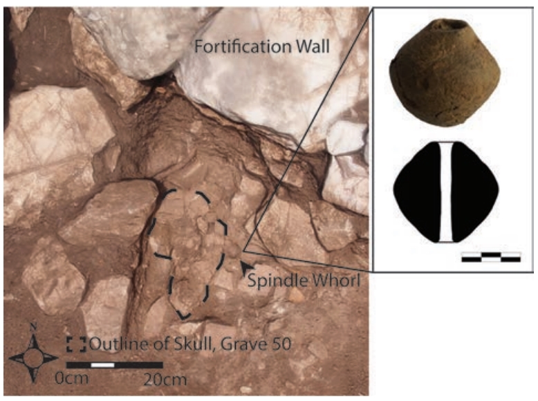 All’interno delle mura sono state scavate 50 tombe, 48 da Valmin e due negli ultimi anni, situate sotto e tra gli edifici. Sono semplici tombe a fossa o tombe a cista, i cui lati erano costituiti da lastre di pietra o erano costruiti con pietre più piccole. Le sepolture singole erano le più comuni, anche se alcune delle tombe contenevano due individui, altre diversi. Due delle tombe non contenevano ossa umane. Nove delle sepolture erano di adulti e le altre di bambini, tra cui le due che sono state esplorate durante gli scavi recenti. Il corpo nella prima (nella stanza D43) era troncato con solo il cranio lasciato in situ e nessun corredo funebre. La seconda sepoltura (nella stanza D45) era una tomba a fossa adagiata su e all’interno di un riempimento di pietre. I resti umani erano in cattivo stato di conservazione, come era generalmente il caso nel sito, con un fuso trovato vicino al cranio come unico potenziale corredo funebre.