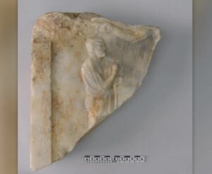Particolarmente degna di nota è la parte superiore di una stele di marmo, una lastra di pietra verticale con un disegno, spesso usata come lapide sepolcrale nell’antica Grecia. Sulla stele, un uomo barbuto in piedi viene incoronato da qualcuno con una mano destra muscolosa, forse l’eroe stesso Aiace. Si è conservato anche un frammento di colonna di marmo con parte di un’iscrizione.