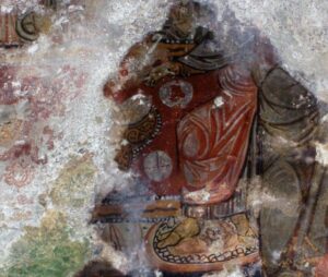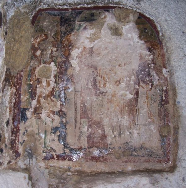 A protezione del bema nell’angolo orientale della parete nord si trova affrescata una maestosa figura dell’Arcangelo Michele, che assume anche una funzione “apotropaica”. L’iconografia palesa la sua ispirazione iconografica a quella degli alti dignitari della corte bizantina, mediante una serie di prestiti formali come la veste arabescata sotto il loros imperiale e gli stivali rossi.