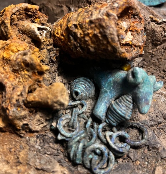 “Particolarmente ricco il corredo. – afferma la Direzione dei Musei della Basilicata – La testa era ornata da un copricapo in bronzo composto da una cuffia realizzata con emisfere, tubuli spiraliformi con fermi a disco e a catenelle. Anelli in bronzo e ferro erano posti alle dita delle mani e dei piedi. Sulla veste erano fibule di diverso tipo. Grazie al restauro è ora visibili una statuetta di ariete in bronzo utilizzata come pendente, posta nella mano sinistra della defunta appesa ad una catenella realizzata da anellini in bronzo e da vaghi in vetro colorato giallo. Vasi in ceramica dipinta completavano il ricco corredo. Il lavoro di restauro in corso presso il museo permetterà il recupero di tante altre tombe conservate nei depositi”.