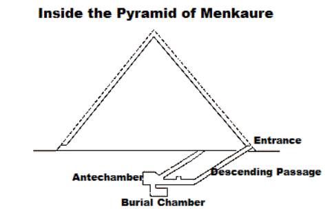 L’interno della piramide è molto complesso. Presenta un ingresso a nord a circa 4 metri d’altezza che conduce in un tunnel rivestito di granito rosa di circa 32 metri e con un’inclinazione di 26° ed un successivo grande corridoio di circa 13 metri di lunghezza, 4 metri di larghezza e 4 metri di altezza.