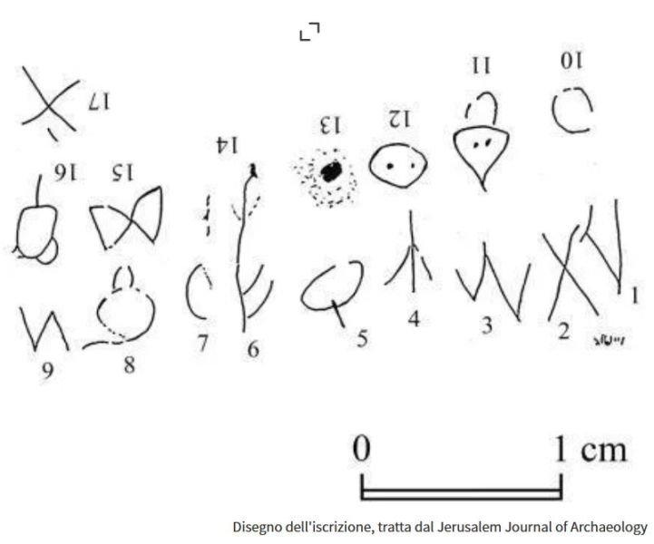 Il reperto, che misura 3,5 cm per 2,5 cm, è stato scoperto nel 2017, ma le incisioni sono state individuate solo nel dicembre dell’anno scorso. L’analisi dei segni ha confermato che si tratta di scrittura proto-cananea, il primo alfabeto inventato circa 3.800 anni fa, anche se i ricercatori ritengono che l’oggetto sia stato realizzato intorno al 1700 a.C..