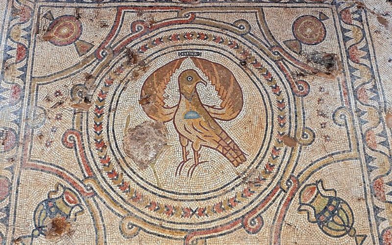 Inizialmente eretta durante il regno di Giustiniano (527-565 e.v.), la chiesa fu ulteriormente ampliata con il denaro donato dall’imperatore Tiberio II Costantino, che governò dal 574 al 582 (circa due secoli dopo la divisione tra Bisanzio e Roma e un secolo dopo il crollo dell’Impero Romano d’Occidente). Il coinvolgimento personale di Tiberio II Costantino nel progetto è attestato da un’altra iscrizione greca trovata in una grande cappella annessa datata 583 e.v., un anno dopo la sua morte. La cappella doveva probabilmente commemorare il sovrano da poco scomparso, evocato da una grande aquila imperiale ad ali spiegate che appare nel mosaico al centro della cappella.