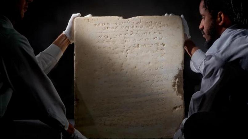 Come capita spesso, quando si fanno lavori in aree che provengono dal passato, si trovano reperti della cui esistenza non esistevano segni. È ciò che capitò, nel 1913, lungo la costa meridionale di Israele: si stavano eseguendo lavori lungo la linea ferroviaria che attraversava luoghi nei quali un tempo erano strutture importanti, quali templi, chiese e sinagoghe, quando gli operai si trovarono davanti una lastra lapidea di 60 centimetri di altezza, di 50 di base e del peso di 52 chilogrammi, riportante incise su una faccia delle iscrizioni, alle quali non fu dato nessun peso, non si sa se per disattenzione o per ignoranza: forse la seconda ipotesi è la più veritiera.