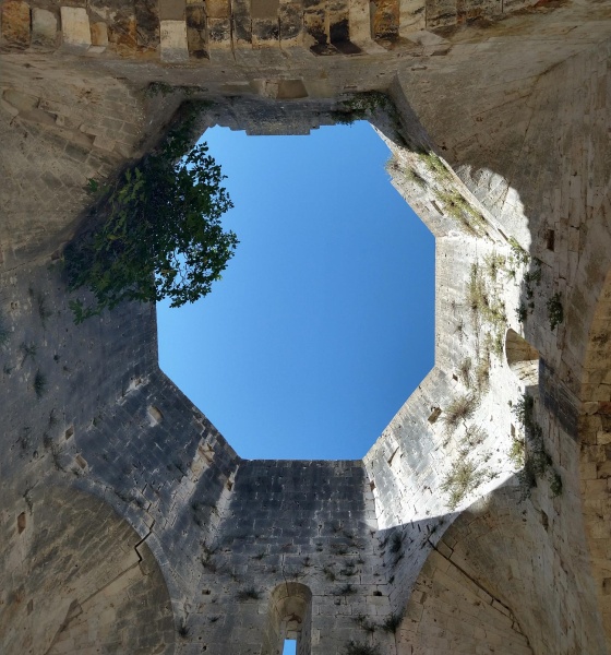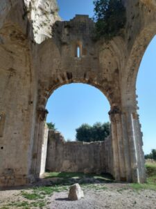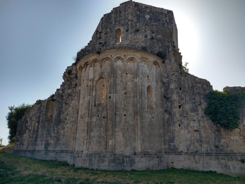 In mezzo a tanto sfacelo, la parete interna dell’abside s’è conservata piuttosto bene, coi suoi conci lisci e regolari di travertino: se prima d’entrare si provava un senso di riverente disagio, adesso si comincia ad avvertire un’ombra di tranquillità, quell’impressione di limpida quiete contemplativa che si riesce a provare solo dentro a una chiesa romanica, dentro a uno di quegli antichi templi così semplici, così severi, che Giovanni Lindo Ferretti, tenendo a mente le pievi romaniche della Lunigiana, riteneva più rispondenti a un’idea di chiesa pura, “cassa armonica in mattone o pietra, perfetta per il culto e la preghiera, l’ascolto, l’abbandono interiore, la comunità orante, l’accoglienza del corpo e il librarsi dell’anima allo Spirito”. A San Bruzio, quest’abbandono è amplificato dai suoni della natura, dalla brezza leggera di sale che s’insinua tra le rovine e scuote con dolcezza le fronde degli ulivi, dal canto monotono e cadenzato delle tortore, dalle piante che han preso possesso delle pietre, uniche presenze vive nella chiesa dove un tempo officiavano i benedettini, dal tiburio scoperchiato che invita ad alzare gli occhi e a guardare per un attimo l’infinito. La divinità, allora, vive dentro ogni anfratto, impregna ogni pietra, ogni opera umana, è nella brezza, negli ulivi, nelle tortore, nel cielo, pulsa in ogni singolo filo d’erba che circonda la chiesa di San Bruzio e, all’interno, le fa da pavimento.