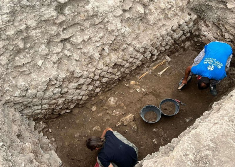 La zona dell’anfiteatro aveva restituito, nella campagna 2022, un’area cimiteriale di piena età medievale e una sepoltura di V sec. d.C. nel saggio di approfondimento accanto al suo muro.