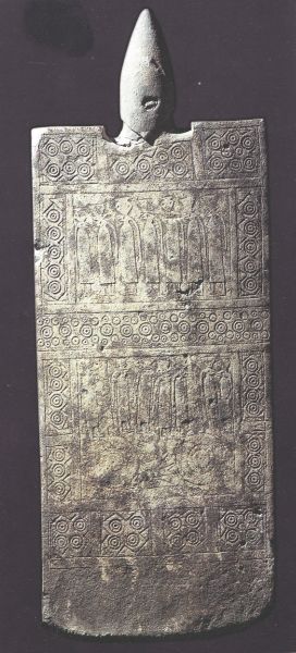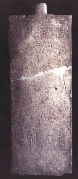 Fig. 4. Manfredonia, Museo Nazionale. Stele daunia con armi. Tipo I, fabbrica di Siponto. Misure. cm. 115x43x7. Lato B. inv. n. 0972-0974.