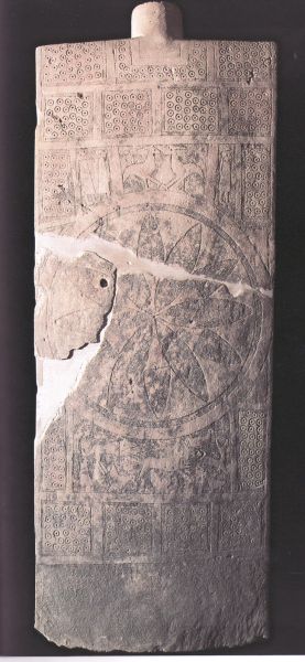 Fig. 2. Manfredonia, Museo Nazionale. Stele daunia con ornamenti con testa conica di tipo aniconico. Tipo II, fabbrica di Siponto. Misure: cm. 113×43,5×6. B. inv. n. 0235.