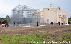 Il miracolo di Siponto sta soprattutto nell’opera realizzata da Edoardo Tresoldi: una gigantesca griglia metallica del peso di 7 tonnellate che ricostruisce i volumi della basilica paleocristiana.