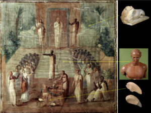 La sua disamina prosegue attraverso una lucida ed approfondita analisi anche di altri elementi rinvenuti nei suoi scavi, che lo portano a riconoscere anche nei piccoli (ed apparentemente poco significativi) frammenti di marmo bianco e di ardesia rinvenuti parte delle teste, dei becchi (in bianco) e delle code nere degli ibis, uccelli sacri alla dea, che sono altresì raffigurati nell’affresco da Ercolano, conservato al Museo Archeologico Nazionale di Napoli, in cui è rappresentata la cerimonia misterica delle feste dette “Isia”, che si svolgevano dal 28 ottobre al 3 novembre (Fig. 6).