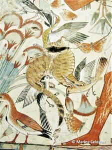 Il pittore dimostra, secondo me, un’approfondita conoscenza di questo animale, che si ritiene venne addomesticato in Egitto verso la fine del Medio Regno, ed in questa scena raffigura l’animale mentre, con un balzo atletico dalla barca di papiro del padrone, cattura ben tre uccelli, uno afferrandolo per le ali con la bocca e altri due stringendoli tra gli artigli.
