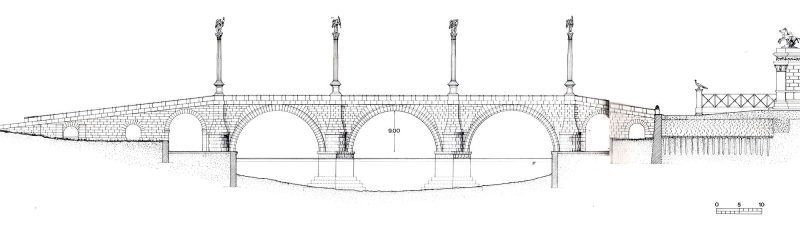 La parte centrale dell’alveo, sotto i tre archi maggiori, era più profonda, per avere un flusso d’acqua costante anche nei periodi di magra, evitando che ristagnasse e diventasse una fogna maleodorante. Poi c’erano altre due banchine artificiali più alte, sotto gli archi delle rampe. L’acqua le raggiungeva solo in occasione di grandi piene o di vere e proprie alluvioni.