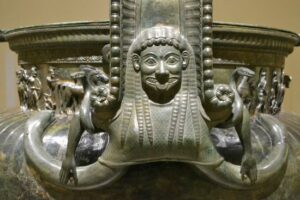 Ma, fra i vari reperti recuperati dal corredo funerario, uno in particolare attirò l’attenzione e l’ammirazione di coloro che partecipavano agli scavi. E’, questo, un cratere in bronzo, dalle dimensioni colossali, avendo un’altezza di 1,64 metri, un diametro di 1,27 metri ed un peso di 208.6 chilogrammi; il corpo del cratere, tolte tutte le sovrastrutture, da solo pesa 80 chilogrammi, mentre la sua capacità volumetrica è di 1.100 litri. E’ stato prodotto con certezza nella Magna Gecia.