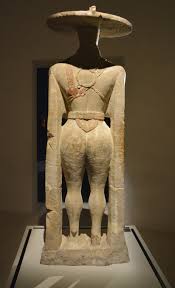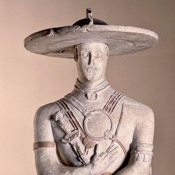 Ciò che del suo abbigliamento è curioso è lo strano grande copricapo, che qualcuno ha assimilato ad un sombrero messicano e che copre le orecchie, a forma di disco, del diametro di 65 centimetri, che è costituito da un blocco di pietra, distinta da quella del corpo, con sopra una calotta semisferica con una cresta, parzialmente distrutta. Forse il cappello aveva una funzione rituale o, chissà, era uno scudo protettivo per il capo come qualcuno ha ipotizzato: del resto, sembra che nell’antichità, i militari usassero tenere lo scudo sulla testa (sinceramente, è la prima volta che sento parlare di questo uso).