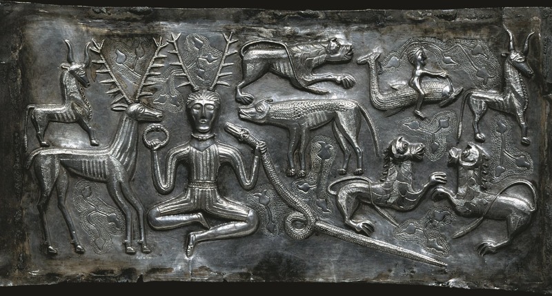 Lamina interna A – La prima lamina della corona mostra un personaggio seduto alla turca con le corna di cervo, avente un collare al collo e uno nella destra, simboli di nobiltà, mentre nella sinistra stringe il collo di un lungo serpente munito di corna di montone; come detto più sopra, è Cernunnos o Cù Chulainn. Gli fanno compagnia un cervo, un cane, due tori, forse destinati al sacrificio, un leone o altro animale, che digrigna i denti, e due leoni che lottano fra di loro. Inoltre, un personaggio sta cavalcando un pesce che qualcuno ha individuato come storione e altri come un delfino: il dubbio rimane non essendo possibile vedere se la coda sia verticale od orizzontale.