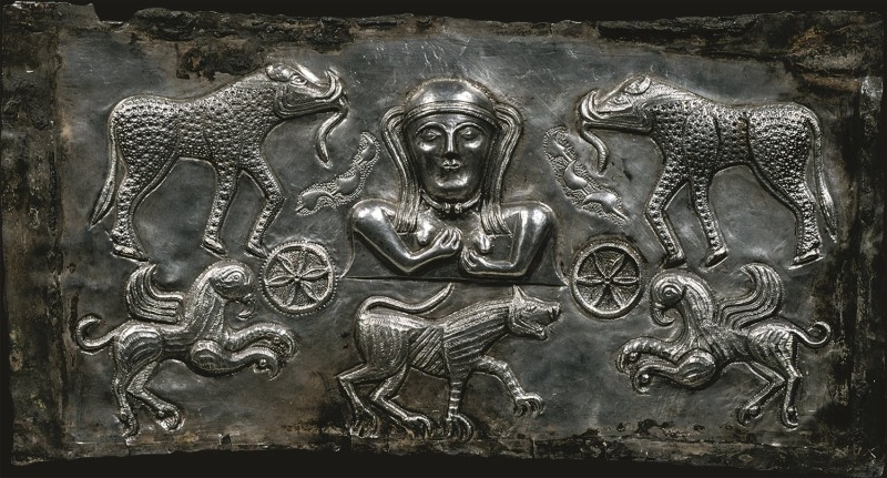 Lamina interna C – La lamina riporta il busto di una figura femminile, identificata come la dea celtica Medb, su un carro di cui sono riportate le ruote; la dea è fra due elefanti con le proboscidi rivolte verso di lei; in basso un cane, rivolto a destra, è tra due grifoni. La scena sembra voler evidenziare la natura marziale della dea e del suo possesso di territorio.