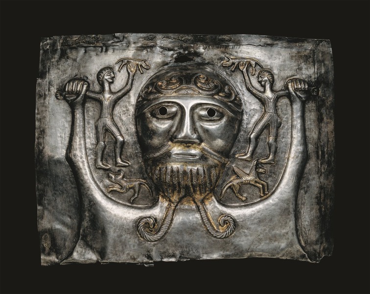 Lamina interna D – Il centro della lamina è occupato dal busto di un uomo barbuto, con un aspetto apparentemente minaccioso, con le mani alzate; sostiene con la mano destra una mezza ruota, cui è aggrappato un personaggio con sul capo un elmo cornuto e con un abito corto; al di sotto è un serpente cornuto, rivolto a sinistra che si trova fra tre grifoni, rivolti pure a sinistra, che corrono. L’interpretazione tratta dalla scenetta da alcuni studiosi è che l’individuo sia Taranis, il capo degli déi celtici, con la ruota, suo simbolo; in effetti, il dio è rappresentato sempre con una mezza ruota e, facendo riferimento a un racconto irlandese, potrebbe essere il già ricordato Cù Chulainn; il serpente con le corna potrebbe essere la dea Morrigan, mascherata da anguilla e calpestata dal personaggio attaccato alla ruota.