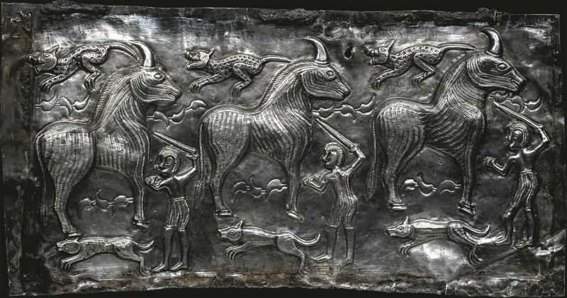 Partendo dal pannello di fondo, questo è di forma rotonda e forse fu utilizzato per chiudere un falla in quello della dimensione giusta; qui, è rappresentato un povero toro cui erano state tagliate le corna, che occupa quasi interamente la scena. E’ appoggiato al suolo su un fianco e alza faticosamente il capo, forse tentando, con un ultimo sforzo, di alzarsi sulle zampe, ma senza riuscirvi. Presumibilmente era stato abbattuto per un sacrificio ed era alla fine della sua agonia, data la presenza minacciosa di una donna armata di spada nella parte superiore. Tre cani, di cui uno probabilmente morto, sono presenti. La realizzazione della figura può richiamare l’uso che si sarebbe potuto fare del calderone, cioè quello di raccogliere il sangue dell’animale morente durante un rito sacrificale.