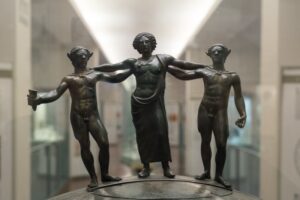 La cista, più che per le decorazioni del coperchio, del corpo, per le tre piccole sculture del coperchio e per i tre piedini, è importante per la scritta in latino classico incisa alla base delle tre figurine: