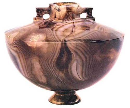 Oggetto fuori dal comune è un balsamario in sardonice, perfettamente conservato e dalle forme eleganti. Molto probabilmente si tratta di un oggetto unico nel suo genere in quanto è formato da un unico pezzo e la perfezione della lavorazione è data da uno spessore costante in tutto il corpo dell’oggetto. Questo balsamario, esattamente come le ambre ed i vetri, è di produzione aquileiese con materia prima proveniente dall’Egitto.