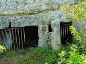 All’esterno l’ingresso è sormontato da una sorta di timpano triangolare scavato con stretti e lunghi solchi nella roccia.