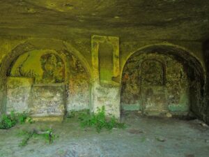 Sul lato nord, presso l’ingresso, è visibile un pozzetto interrato, accanto vi è una tomba ad arcosolio.