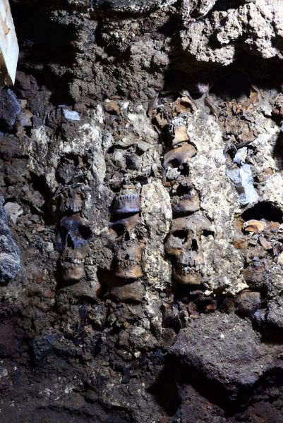 In totale sono 16 gli edifici individuati nelle cantine o nel sottosuolo di case e palazzi. E tra questi lo spaventoso Huey Tzompantli, un luogo monumentale di offerta dedicato a Huitzilopochtli, il dio della guerra. Secondo gli ultimi studi sul campo, i cui dati sono stati messi a confronto con le testimonianze storiche degli spagnoli del Cinquecento, questa temibile struttura era costituita da una piattaforma lunga 36 metri, sulla quale venivano eretti pali con traverse dove venivano inchiodati i teschi dei sacrificati. I pali erano a loro volta affiancati da due colonne circolari, alte quattro metri, composte da centinaia di teschi. Ad oggi sono stati portati alla luce più di 600 crani, ma i resti esibiti dei nemici degli atzechi o dei traditori dello stato, quanto – si presume – dei semplici oppositori, sono certamente molti di più.