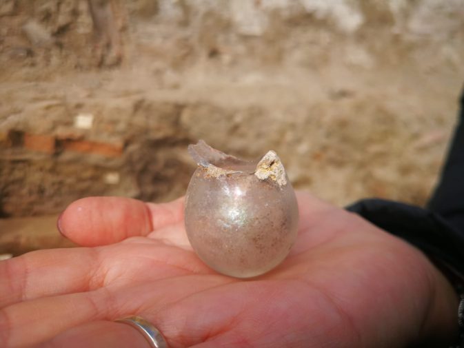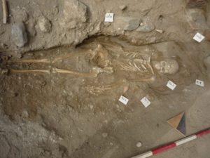 E sono state riscontrate diverse tipologie di sepolture. È per esempio attestato il rito dell’inumazione, con individui deposti in fosse terragne o in casse di mattoni, con il cranio orientato a Est, e anche il rito dell’incinerazione con il rinvenimento di bustum. È stato recuperato anche un corredo funerario, con alcuni pezzi anche parecchio importanti. È prevalentemente costituito da unguentari fusiformi, una tipologia molto ricorrente nelle tombe di età tardo ellenistica. E c’è da segnalare anche il rinvenimento di una lucerna, di una coppa megarese (un bel “pezzo”) e di un’ampolla vitrea.