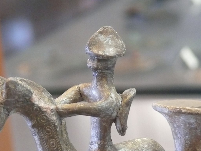 Il reperto (alt. cm 17,7) rappresenta un animale fantastico con corpo di uccello e testa di toro, dotato di lungo collo e corpo panciuto. L’ansa (manico) è a forma di cavallo montato da un cavaliere/guerriero con elmo e scudo sulle spalle.