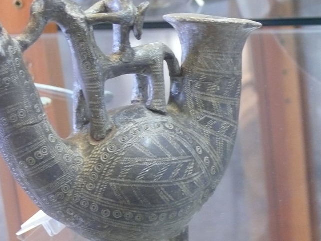 L’askos è decorato con motivi geometrici a cordicella e cerchielli impressi.