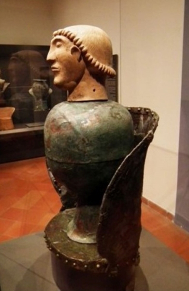 Databile alla fine del VII, inizi VI secolo a.C. il cinerario è composto da una testa in terracotta modellata a tutto tondo con dettaglio dei lineamenti (canopo di tipo evoluto) e da un vaso ovoidale (che rappresenta il corpo del defunto) in bronzo.
