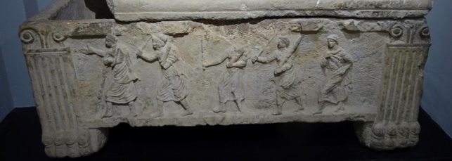 La cassa del sarcofago con recumbente maschile (Laris Flave) presenta il corteo di un magistrato del quale fanno parte i littori con i relativi attributi. La cassa relativa alla deposizione femminile è lavorata con scena di commiato, con rappresentazione, tra l’altro, di dextrarum iunctio.