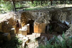 La tomba 2 è più semplice ed è composta da un breve corridoio e da due celle consecutive con banchine e spallette. Le celle erano munite di banchine e contenevano, tra l’altro, sarcofagi ed urnette funerarie. La tomba ha restituito anche preziosi reperti in oro (collane, anello, laminette e borchiette) L’ipogeo fu utilizzato dal V al II secolo a.C.