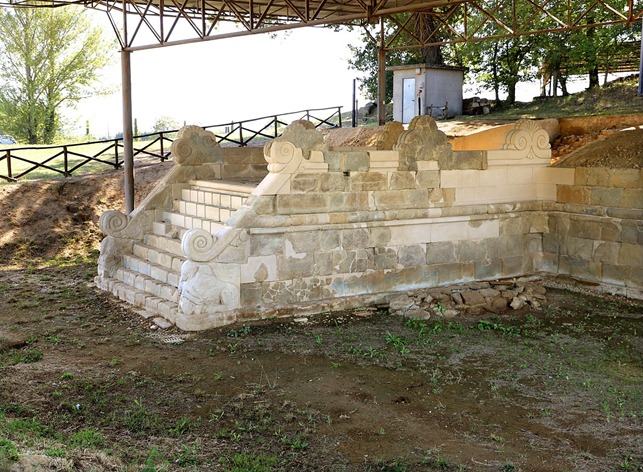 Ad est è stata portata alla luce una monumentale piattaforma altare (lungo 7 m., largo 6) dello stesso periodo della tomba 1. Vi si accede tramite una gradinata (residuano sei scalini) con ante decorate da palmette e alla base da blocchi scolpiti con scene di lotta: un guerriero, con lunghe trecce e vestito di corto chitone, cerca di colpire con un pugnale una fiera (leone?) che lo sta fagocitando. Nell’area circostante il tamburo sono stati rinvenuti frammenti di terrecotte architettoniche che con tutta probabilità facevano parte del tetto di una costruzione a carattere sacro. E’ stato ipotizzato che la scalinata possedesse una seconda rampa, che consentiva l’accesso alla sommità del tumulo ove era collocato una sorta di tempietto legato alla cerimonia funebre ed ai relativi riti. Secondo altra tesi i frammenti di terrecotte architettoniche potrebbero invece riferirsi ad un grande sacello funerario realizzato in epoca successiva al tumulo e nei pressi dello stesso, dove sono state individuate parti delle fondamenta di un grande edificio.