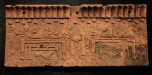 La figurina recumbente riprodotta sul coperchio di un cinerario nell’atteggiamento di un commensale proveniente dalla necropoli di Tolle (Chianciano – Siena) della fine del VII secolo a.C. costituirebbe la testimonianza più antica della nuova iconografia etrusca del banchetto (peraltro la mancanza del letto e di altri accessori lascia qualche dubbio su tale interpretazione).
