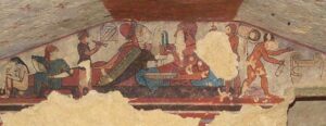 In Etruria intorno ai primi del VI secolo a. C. cominciano ad apparire frequenti rappresentazioni del banchetto nell’ambito quotidiano (ad es. sulle lastre di terracotta decorate a rilievo provenienti dal Palazzo di Murlo, nei pressi di Siena, del VI secolo a.C.) ed in quello funerario (ad es. nelle pitture tarquiniesi della Tomba della Caccia e della Pesca della fine del VI secolo a.C. e della Tomba del Frontoncino della metà del VI secolo a.C.) i cui partecipanti non sono più rappresentati seduti, ma distesi, da soli, in coppia od anche in più persone, su letti triclinari.