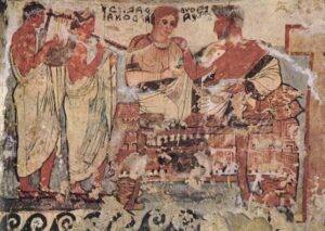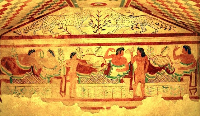 Gli autori antichi (Diodoro Siculo, Aristotele, Posidonio di Apamea, Teopompo, etc …), fanno riferimento al banchetto etrusco.