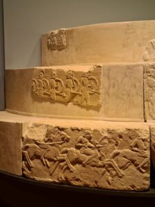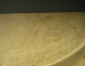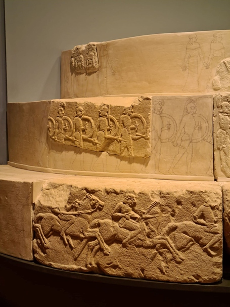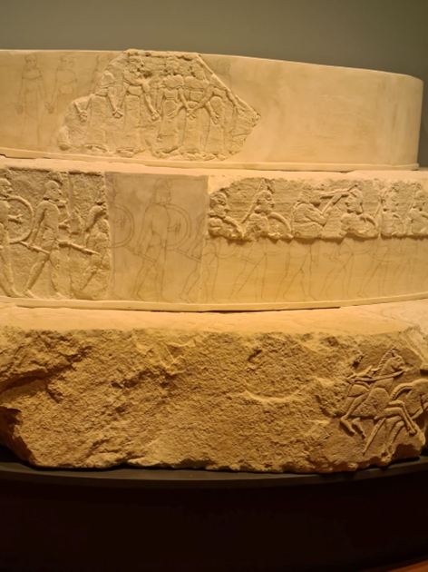 Sulla faccia verticale, partendo dal basso, vi erano una teoria di cavalieri in corsa, una sfilata di armati stanti (opliti muniti di elmo, scudo ed asta corta) con suonatore di tibia ed un gruppo di danzatrici (con lungo peplo cinto in vita e mantellina chiusa sul davanti). Le superfici orizzontali dei primi due dischi erano decorate con vegetali stilizzati (catena di fiori di loto e palmette). Nel disco superiore per quanto è stato possibile comprendere (si tratta della novità principale dell’ipotesi ricostruttiva) vi doveva essere rappresenta una scena di battaglia con guerrieri in lotta.