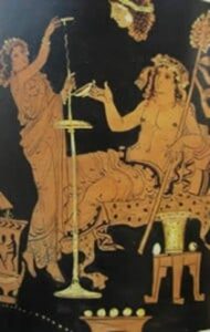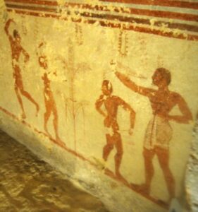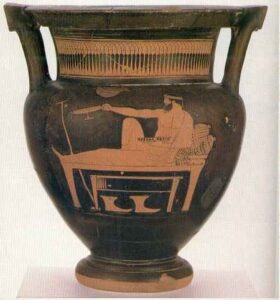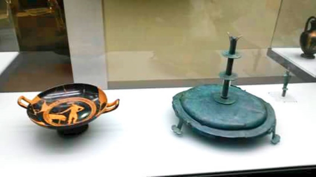Di seguito immagini del gioco del kottabos riprodotto su ceramica a figure rosse, sulla tomba Cardarelli e di parte dell’attrezzatura utilizzata per il gioco proveniente dal territorio di Perugia e Vetulonia.