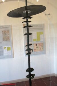 Un’altra modalità (particolarmente attestata da riproduzioni su vasi di ceramica a figure rosse nonché da alcuni reperti della specie rinvenuti in Etruria e conservati al Museo Archeologico di Firenze ed al Museo Archeologico dell’Umbria a Perugia) consisteva nel lancio da parte dei giocatori del residuo della bevanda contro un dischetto (plastinks) posto in bilico su un’asta metallica (di circa 1 metro e 50 / 2 metri) terminante con una base, con lo scopo di farlo cadere su un altro piattello più grande che era fissato alla metà dell’asta. Negli esemplari rinvenuti in Etruria l’asta generalmente termina con una figura umana (o un satiro) che a sua volta regge il dischetto.