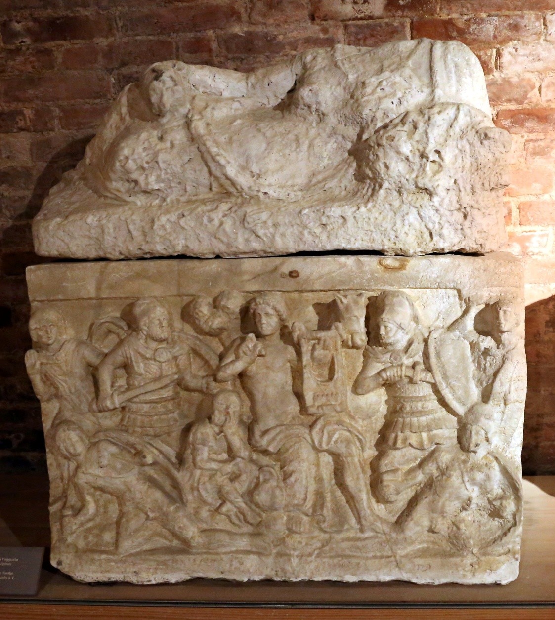 In alcune urne della specie vi sono anche altri uomini in armi posti dietro i fratelli Vibenna o inginocchiati agli angoli inferiori del campo (sono soldati dei Vibenna o sono nemici?).