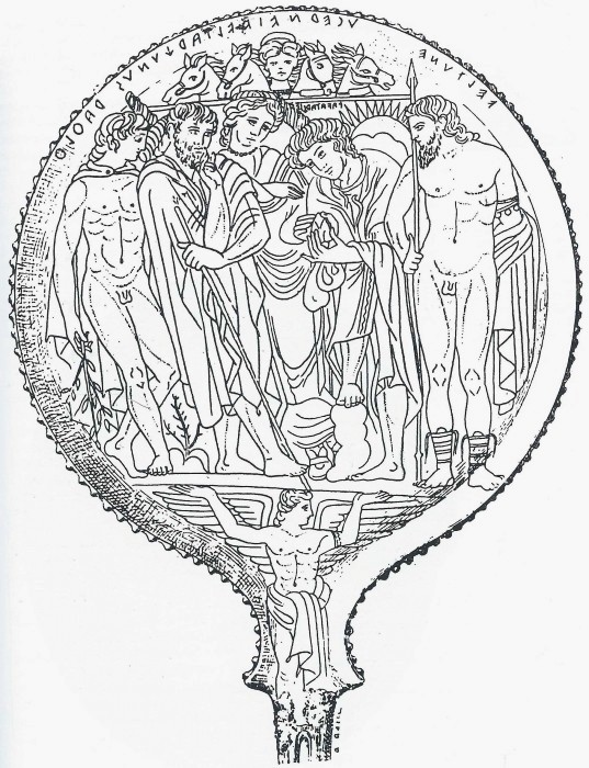 Di seguito immagini della gemma del Museo di Villa Giulia, della statuetta da Tarquinia e dello specchio da Tuscania.