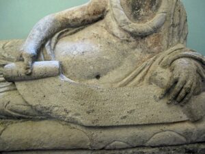Sul coperchio vi è rappresentato il defunto, un uomo anziano semi recumbente con braccio sinistro appoggiato su due cuscini, che tiene tra le mani un rotolo (papiro) parzialmente aperto recante una lunga iscrizione in parte lacunosa. Si tratta del più lungo epitaffio etrusco conosciuto.