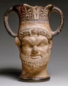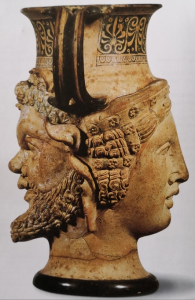 Trattasi di un vaso configurato a doppia protome umana (gianiforme): da un lato presenta la faccia di un satiro, sull’altro vi è un viso femminile, probabilmente una menade.