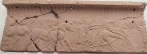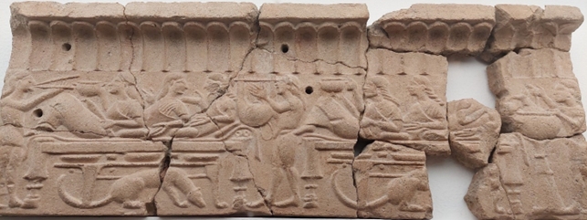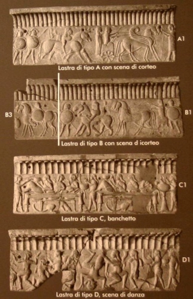 Le scene riprodotte sulle lastre, similmente a quelle rinvenute nella regia di Murlo, alludono al fasto della corte (banchetto e danze) ed elevano il principe in una sfera eroica identificandolo con Ercole (rappresentazione delle fatiche di Herakles).