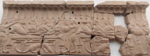 Negli strati di crollo dell’edificio sono stati rinvenuti numerosi frammenti della decorazione architettonica ed in particolare un tipo di antefissa a testa femminile e quattro diversi tipi di lastre in terracotta a rilievo decorate a stampo. I due elementi ornamentali erano in opera contemporaneamente. Le lastre (altezza cm 21; lunghezza cm 60) e le antefisse (altezza cm 14, larghezza cm 14) dovevano essere collocate lungo il margine del tetto e sui coppi ed erano dipinte con vivaci policromie (rosso, bianco, nero e giallo).