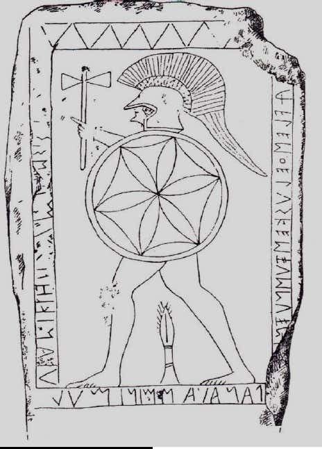 Sulla stele vi è raffigurata una figura maschile (il personaggio oggi è appena percettibile) di profilo verso sinistra con elmo piumato di stile corinzio, ascia bipenne impugnata con la destra e grande scudo rotondo decorato da sei foglie che si uniscono al centro. Il guerriero, che sembrerebbe privo di schinieri, è scalzo e tra i piedi vi è un cespuglio o una palmetta stilizzata.