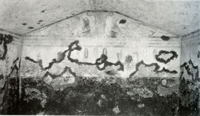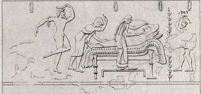 L’altra tomba tarquiniese del Letto Funebre (della fine della prima metà del V secolo a.C.) sulla parete di fondo presenta invece un letto funebre riccamente adornato ma vuoto con ai lati figure maschili (due) e di una donna in atteggiamento di omaggio e di saluto.