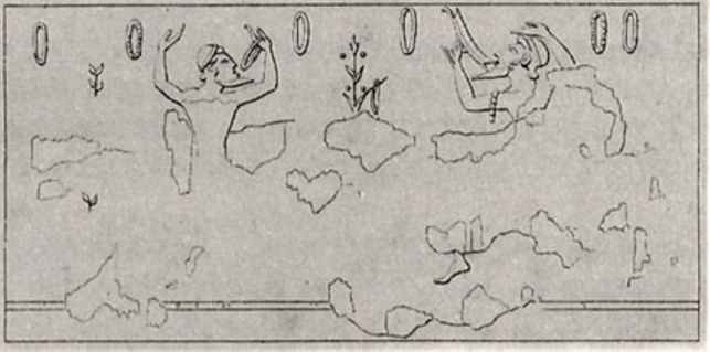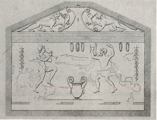 Sulla parete adiacente altri due personaggi maschili si esibiscono in una danza, uno è rappresentato nell’atto di tracannare vino da una coppa, l’altro fa girare una ghirlanda nella mano.
